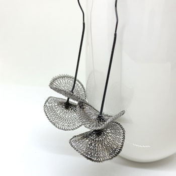 These Lyric Vega drop earrings each have two curved discs crocheted by hand in fine stainless steel wire. The discs have subtle areas with darkened patina and a light and playful shape. They hang on a sterling silver chain oxidised to a beautiful charcoal colour.