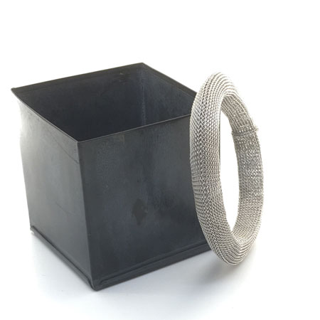 The bangle is made of fine stainless steel wire crocheted by hand into a thick, hollow shape with an edge. The bangle is approximately 11mm high and has an internal circumference of 19cm, which is a medium size.