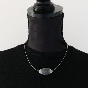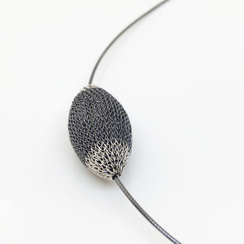 This Milena Zu necklace has a woven bulbous shape made in fine stainless steel wire. The shape sits on a sterling silver chain which has been oxidised to a beautiful charcoal colour. The lock is made of stainless steel and oxidised to the same grey colour.