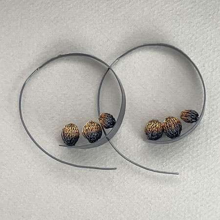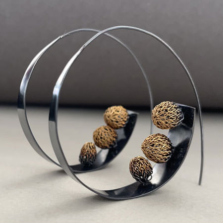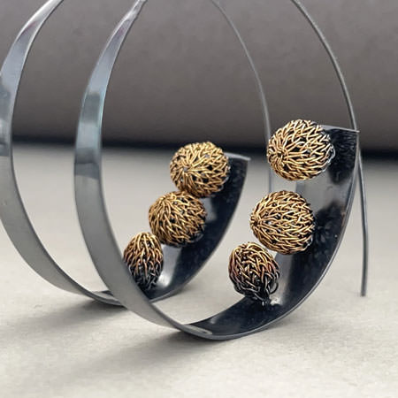 These contemporary hoop earrings are made by Italian designer, Milena Zu. The large brass hoops are open with a very long ear wire extending below the hoops. Inside the hoops are 3 small crochet balls made from fine brass wire and plated in 24ct gold.