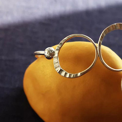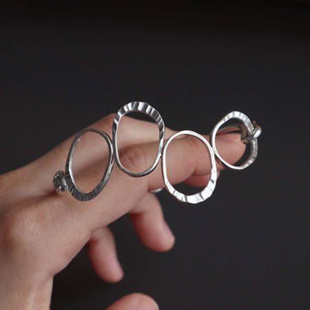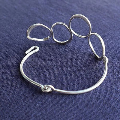 It has four irregularly joined rings which are organically shaped and partly line hammered. The bangle closes with a hook and is slightly oval in shape so the rings will stay on top of your wrist.