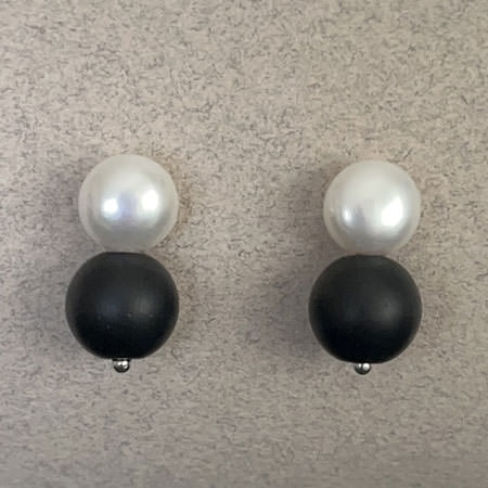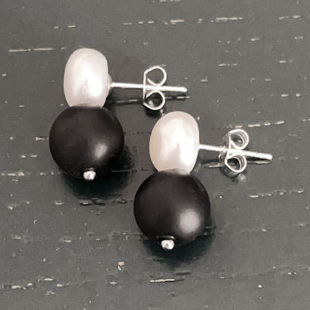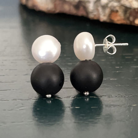 The stud earrings are sterling silver and 19mm long with a 9mm button pearl and 10mm onyx bead.