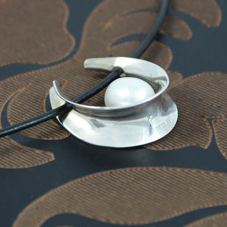 This silver pearl pendant comes on a 40cm black leather cord and is 25mm long and 23mm wide.