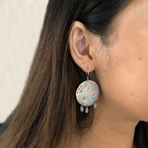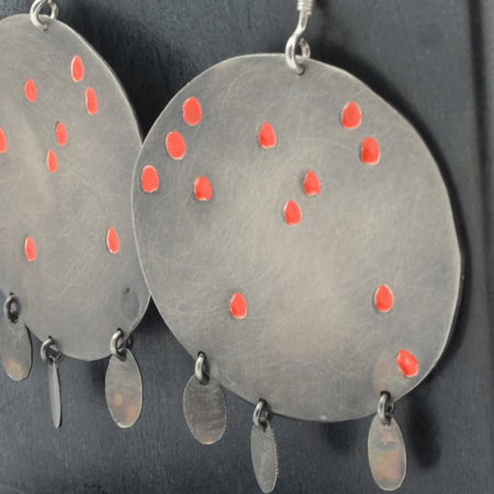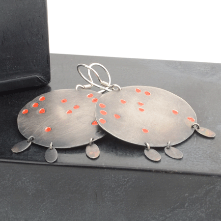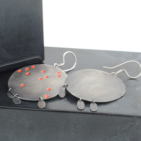 These sterling silver earrings are handmade in a modern boho style. They have large round discs which have been oxidised to a charcoal grey colour. The grey looks beautiful as background to the little puddles of red paint.