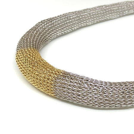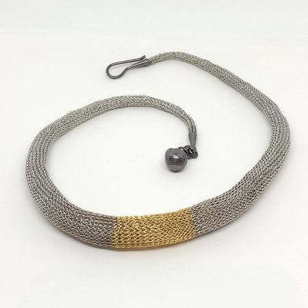 Milena has perfected her tube designs and offers them in various metals. This necklace is crocheted from fine stainless steel wire, making it both flexible and beautifully shimmering. A section of gold-plated brass wire at the centre adds a hint of warmth to the steel grey, creating a striking contrast.