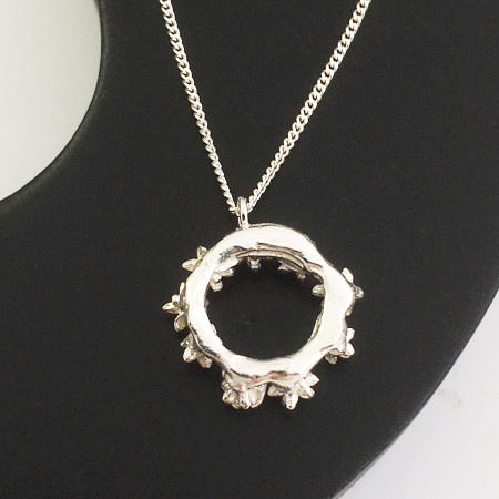 This sterling silver necklace has a little wreath decorated with beautiful seed pods. The pod tips have a high polished silver finish that makes the pendant sparkle.