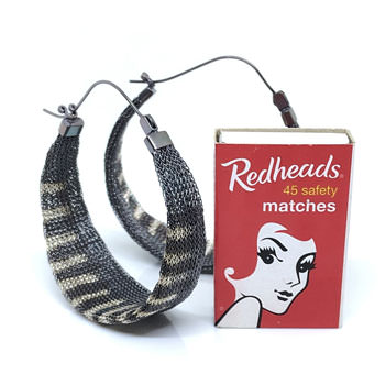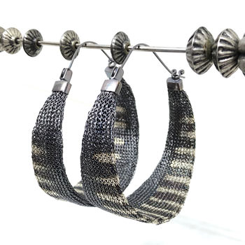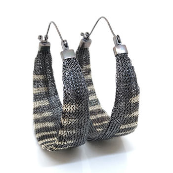 The hoop earrings are crocheted by hand using fine brass wire, then silver plated and oxidised to a warm grey colour.