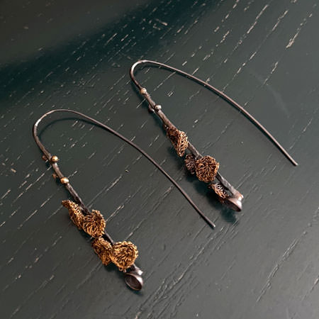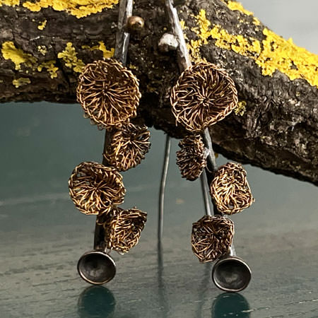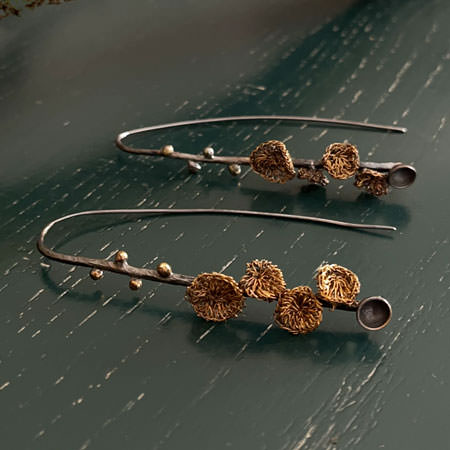 The Capella blossom earrings are made in silver plated copper which has been oxidised to dark grey colour. The little blossoms are crocheted by hand using fine brass wire and then gold plated. These Milena Zu earrings hang 55mm from the top of the earwire and the largest blossom is 10mm wide.
