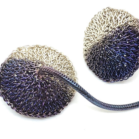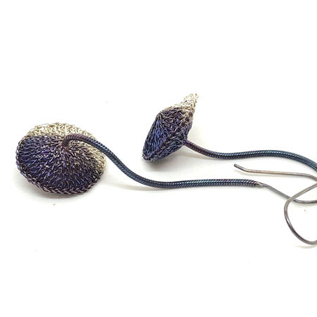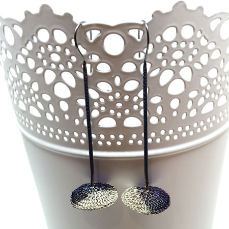 These Milena Zu earrings are crocheted with fine brass wire which has been silver plated and half oxidised. The earrings have a puffed disc shape which hangs on a sterling silver chain. The chain has also been oxidised to a beautiful bluish colour with a slight purplish tinge.