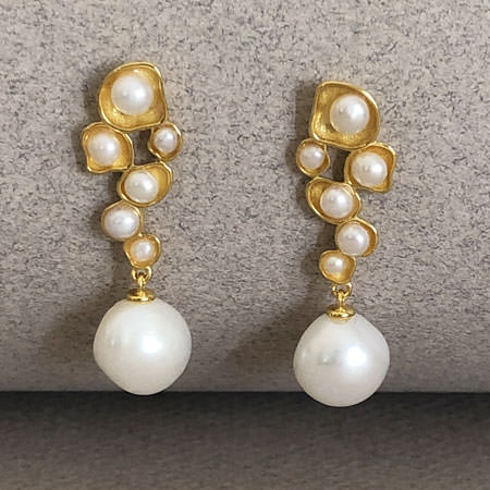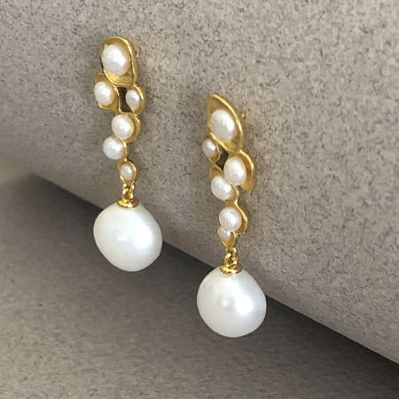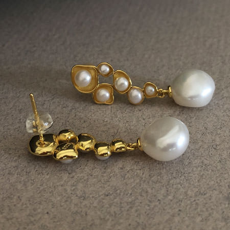 The pearl earrings have cascading drops with little freshwater pearls and a baroque pearl dangling at the end. These pretty pearl earrings are made from gold plated sterling silver and are 35mm long.