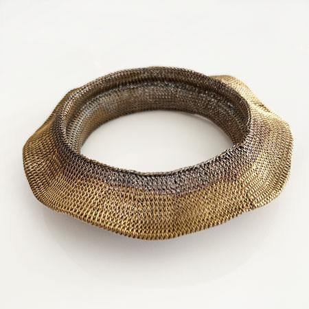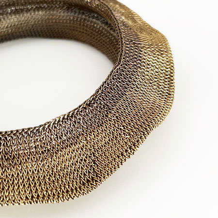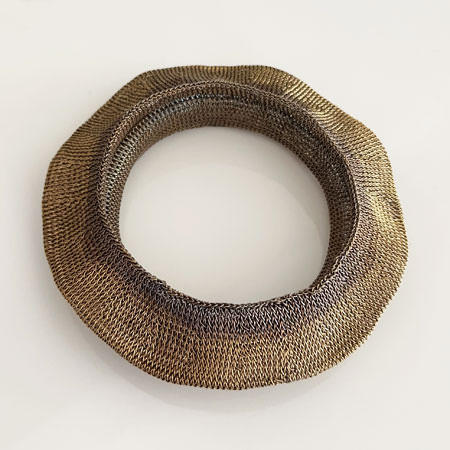 This distinctive piece by Milena Zu combines a wide, eye-catching shape with subtly wavy edges in warm, radiant gold tones. Each bangle is meticulously hand-crocheted from fine brass wire, oxidised, and partly plated with 24ct gold for luxurious texture.