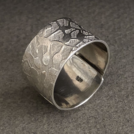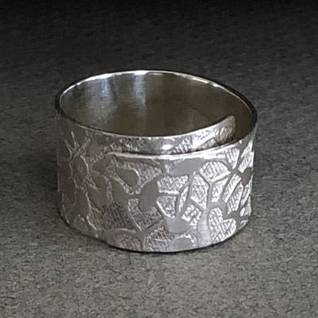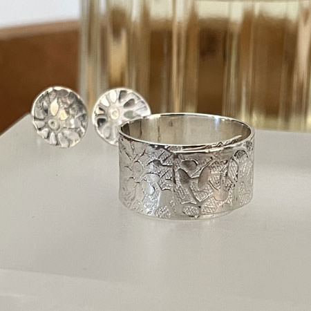 This Australian ring has a pretty, floral pattern slightly raised on a textured background. It is discreet but unique and very comfortable to wear.